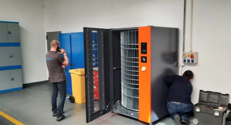 Instalacja dotyczyła automatu D1080 – zobacz ulotkę pdf który słynie ze swojej ponadprzeciętnej pojemności aż 1080 produktów. Dzięki unikalnej funkcji, że komórki automatu mogą regulować się na szerokość ale przede wszystkim na wysokość, nasz klient może decydować na dowolnym etapie eksploatacji urządzenia jakiej wielkości produkty będzie przetrzymywał w automatach, mogą to być frezy nasadzane firmy FABA – zobacz katalog pdf ale można również umieścić w nich obuwie ochronne np. U-POWER GREENLAND UK S3 SRC w rozmiarze 48.