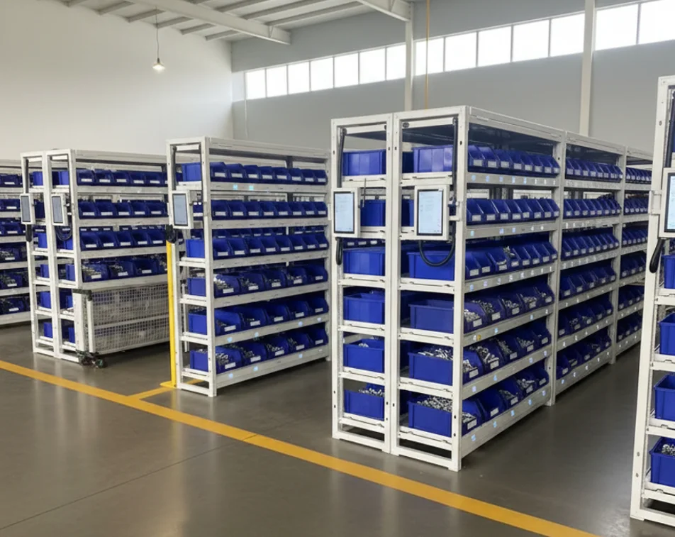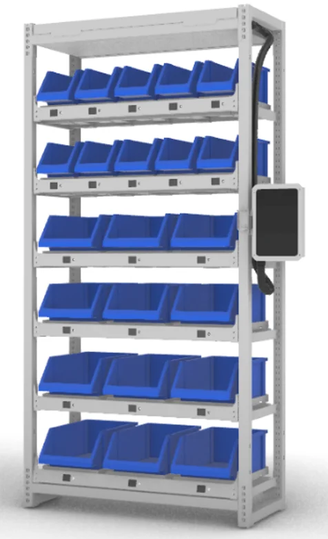 Inteligentny, modułowy regał wagowy BMWS przeznaczony do automatycznego zarządzania zapasami w środowiskach przemysłowych. System umożliwia precyzyjną kontrolę pobrań i odkładania materiałów bez konieczności ręcznego liczenia, skanowania czy ingerencji operatora.